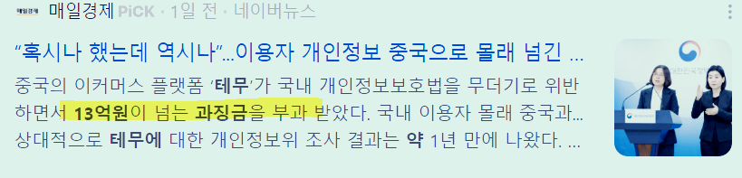 2024년 5월, 개인정보보호위원회는 테무에 대해 약 13억 6900만 원의 과징금과 1760만 원의 과태료를 부과했습니다.