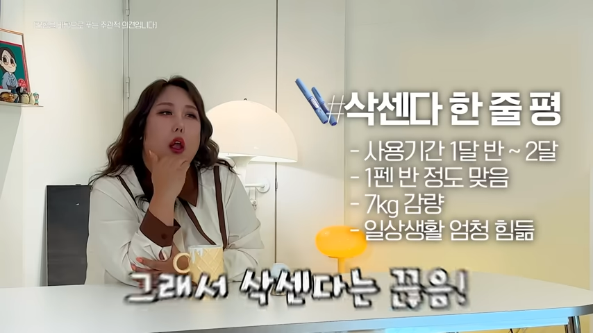 풍자는 "삭센다는 몸에 안 맞는다고 느끼면 당일 주사만 건너뛰면 되지만, 위고비는 한 번 주사하면 일주일을 견뎌야 한다"며, 부작용 조절 측면에서 삭센다가 유리했다고 밝혔습니다.